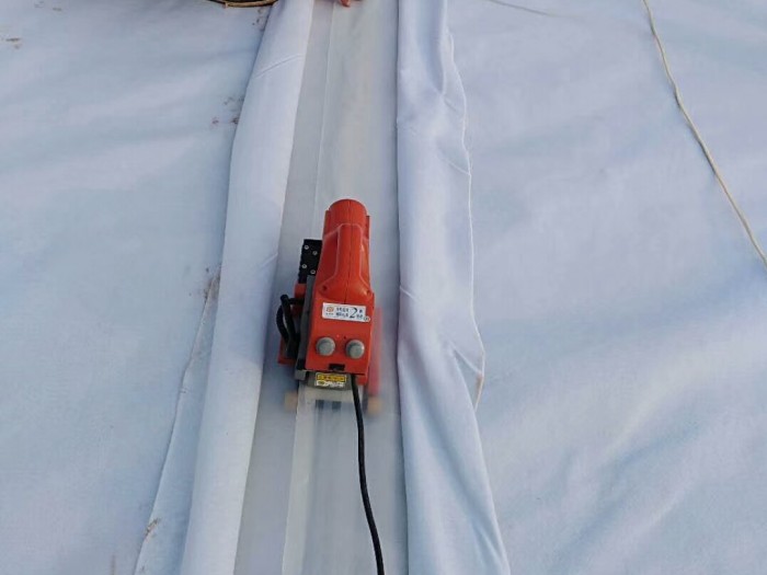 焊接法是借助热焊机等加热设备,将塑膜加热软化, 机械液压或人工加压贴合的方法。采用双轨热熔自动爬行热合机,该机由两块电烙铁供热、胶带轮通过耐热胶带施压,液压塑膜,焊成两条粗为10mm的焊线,两条线净距16mm,焊接效果较好。