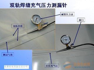 * 双缝充气检测:通过检查双缝的气密性来判断其焊接质量好坏的非破坏性检测手段,在气腔内封闭一定压力的气体,通过检测针上附带压力表的变化来判断其气密性。