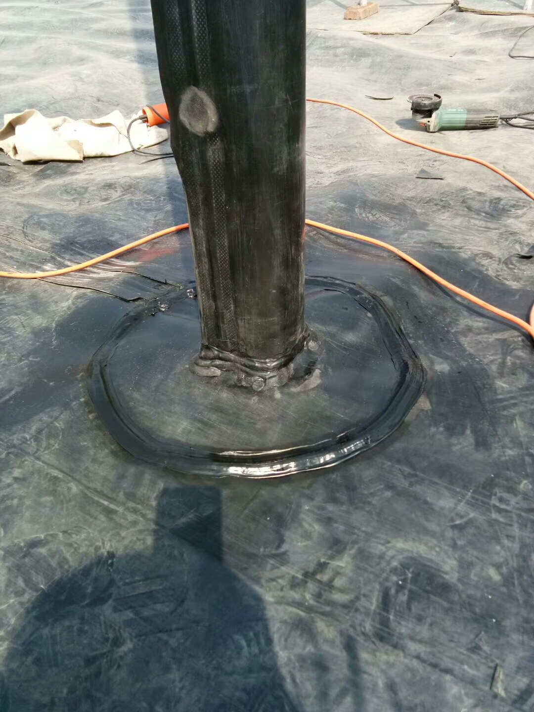 3) 坝管与土工膜的相连; 把HDPE土工膜跟据渗沥液穿坝管的直径大小裁剪成喇叭状的管套,分成6-8小片,然后把关套由大到小的顺序套进穿坝管,再适宜地调整好管套的位置并用热风焊枪临时固定,管套不能有悬空的部位。然后把套管的大小套口接在HDPE土工膜和渗沥液穿坝管上,并用不锈钢箍加固。